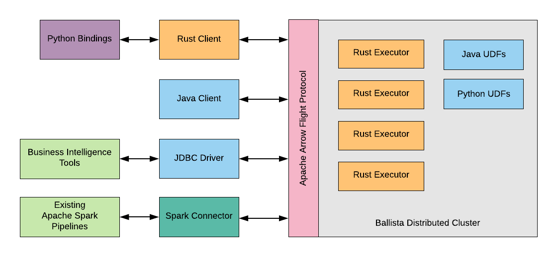 Arrow also provides a “Flight” protocol, designed to enable Arrow data to be streamed efficiently (without serde overhead) between processes, and Ballista’s executors implement this protocol.