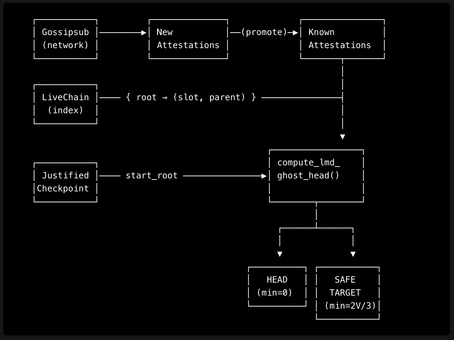 Besides computing the head, the same LMD-GHOST algorithm is used to compute the safe target: a conservative head obtained by setting min_score = ⌈2V/3⌉, so only branches with supermajority support are followed. The safe target feeds into 3SF-mini for justification and finalization decisions. We'll cover this in detail in the next post.
