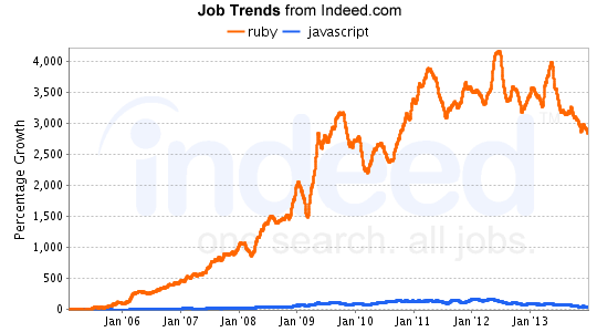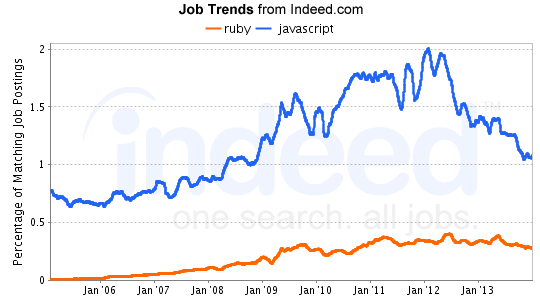 Nevertheless, even if Ruby job postings are way down compared to JavaScript, they are still on the rise and its percentage growth continues to be quite important. In the startup world, there are at least five startupsregistered on AngelList that need a JavaScript developer for each startupthat needs at least someone with Ruby knowledge.