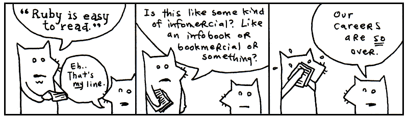Even though I sometimes think that it’s Perl-inherited attitude of having more than one way to do the same thing is overwhelming (for some reason I need to reread Understanding Ruby Blocks, Procs and Lambdasevery month or so), in general I really like its syntax and semantics. I think it’s a very expressive and intuitive language. In my opinion how good a language is is not defined only by semantics, syntax and performance. I am not an academic. I have not even finished university.
