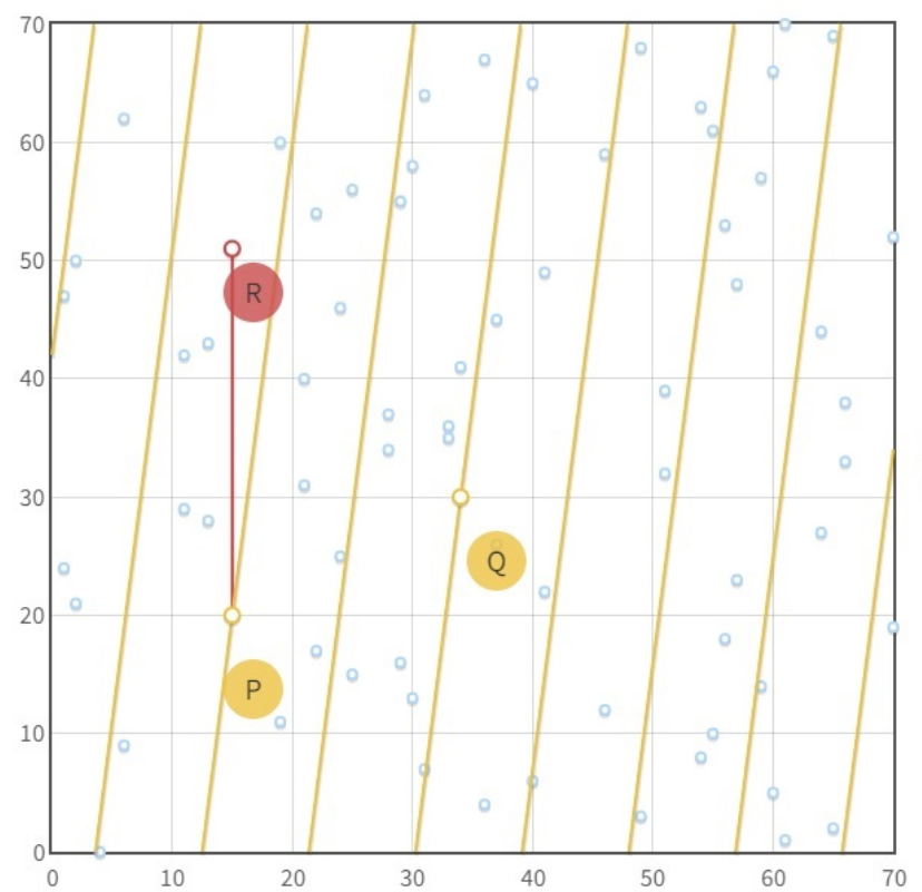If we plot the collection of points onto a graph, we see that the points are distributed in a rather "random" fashion. For example, 2g could be very far from 3g which in turn are very far from 4g. If we wanted to know how many times k we have to add the generator to arrive at a certain point P (that is solving the equation kg=P) we see that we don't have an easy strategy and we are forced to perform a brute search over all possible k. This problem is known as the (elliptic curve) discrete logarithm (log for friends) problem (other friends prefer ECDLP).