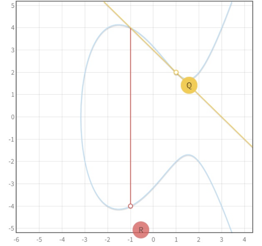 We can define an operation which allows us to sum elements belonging to the elliptic curve and obtain a group. This is done using a geometric construction, the chord-and-tangent rule. Given two points on the curve P1=(x1,y1) and P2=(x2,y2), we can draw a line connecting them. That line intersects the curve on a third point P3=(x3,y3). We set the sum of P1 and P2 as (x3,−y3), that is, point P3 flipped around the x-axis. The formulae are: